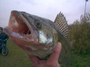 Drugi, tym razem o wiele dalszy rzut po przerwie, pierwsze podkręcenie i puknięcie, zacinam i coś jest. Po holu wyglądało na maluch i skręcając myślę pewnie kolejna trzydziestka, bo tej jesieni akurat takie polubiły moje gumy, jednak gdy zobaczyłem przeciwnika, moja buźka przybrała minkę nr.8 bo zobaczyłem ładnego, ślicznie wybarwionego garbuska, któremu wystawała z pyszczka tylko główka, pazerniak pomieścił całą 5 cm gumę. Na zdjęciu była godzina 14,13 z sekundami i było to cholernie miłe trzynaście minut, pewnie to ktoś na "górze" wiedział że strasznie mnie wkurzyły moje perypetie ze starymi miejscówkami i w nagrodę za taplanie się w błocisku, postanowił mnie wynagrodzić. Chociaż bardziej jestem skłonny wierzyć w to że beton pasuje do sandacza, a sandacz do mnie, bo przecież nie pierwszy raz połaskotał moją dumę, bo jak się dowiedziałem były to jedyne drapieżniki złowione tego dnia, no nie obrażając p. jazgarzy, tych padło wiele.