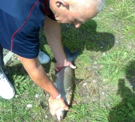 Dokładnie nie wiem ile trwała moja zabawa. W pewnej chwili trochę się przestraszyłem. Pokazało się kawałek płetwy przytwierdzonej do dość dużego cielska i nie było to podobne do sandacza. Mało tego, wyglądało jak duża ryba zahaczona o grzbiet. To był momencik i mogłem się mylić, jednak po kolejnym dołowaniu z odjazdem, już nie byłem niczego pewny. Postanowiłem, no może nie do końca wypróbować moją plecionkę i nie pozwolić mu kolejny raz odjechać. Dokręciłem hamulec, przytrzymałem mocniej a Kolega już trzymał spory podbierak w wodzie. Powolutku najechałem rybą na podbierak, jak tramwajem do zajezdni i kolega z łatwością dokończył dzieła. To nie był sandacz. Ryba niespodzianka leżała już na brzegu gotowa do sesji zdjęciowej. Moja zdolna fotografka była na to przygotowana. Kilka pstryknięć całus i już stałem z rybą nad brzegiem wody, kiedy odezwał się sąsiad od podbieraka. W trakcie sesji powiedziałem coś w rodzaju :"Szybciutko bo szkoda ją męczyć" Kolego zrozumiał że ja jej nie chce i z niepewnością w głosie zapytał: "a nie sprezentował byś mi jej? " No cóż nie dałem i pewnie było mu przez moment smutno. Jednak myślę że zna mnie na tyle żeby wiedzieć że nie zrobiłem tego z chytrości. Mam nadzieje że nadal będziemy dobrymi znajomymi i w razie draki zawsze sobie pomożemy.