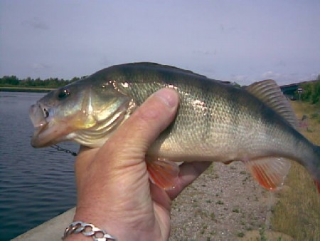 Miałem swoje piętnaście minut, pomyślałem że czas się zwijać i dać innym szansę, chociaż tych innych jakoś nie było widać. Postanowiłem, ponieważ łowiłem blisko brzegu, wykonać jeszcze kilka rzutów pod drugi brzeg. Może jakiś sumik puknie bo w kanale maluszków pływa multum i często podgryzają gumy. Wędkarze robakowcy mają często z nimi do czynienia i niestety nie wszyscy traktują je przyjaźnie... Piąty czy szósty daleki rzut i nagle wyczuwam delikatne pstryknięcie. Na wszelki wypadek podcinam i czuje na kiju coś próbującego płynąc w przeciwnym kierunku do zwijanej plecionki. Z waleczności nic szczególnego i pomyślałem że to rzeczywiście mały sumik. Jednak czym bliżej brzegu tym moja wiara że jest to sumik stawała się mniejsza. Nie walczył tak jak na malucha z jego gatunku przystało i szybko okazało się że to pan, nawet nie malutki okoń zaszczycił mnie swoją obecnością.